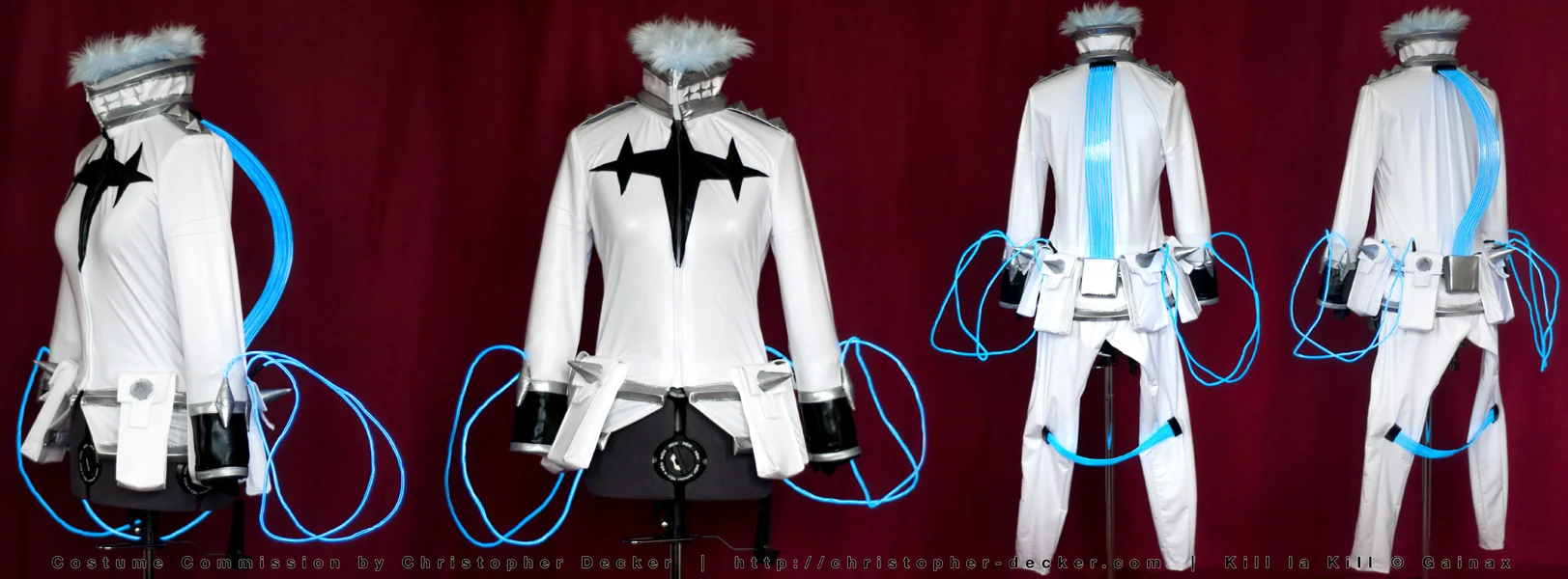 This is by far one of the more difficult costumes I've had to make so far because of the 3D triangle detailing found on the jacket hem and collar. The costume was made from white spandex with a mild liquid sheen. The triangle details were made with a base of cut foam with silver PVC stretched and sewn down taut to make them clean.